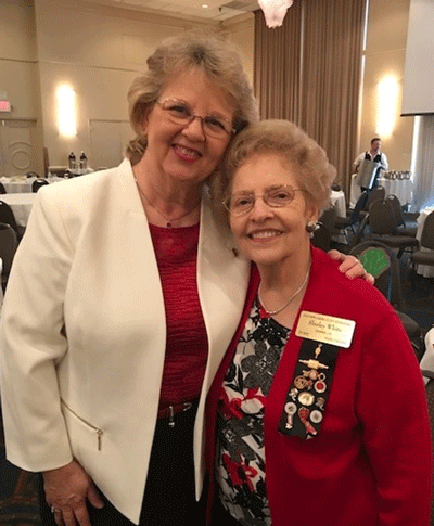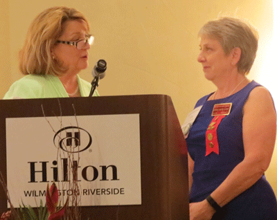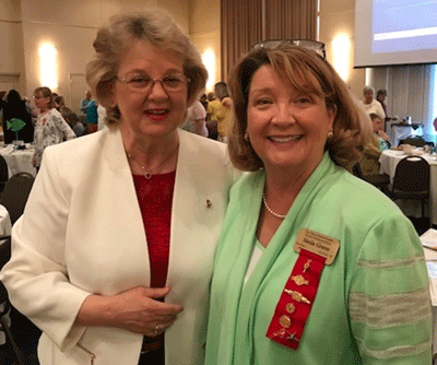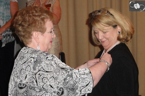April 29, 2017 - Eta State NC Imediate Past President Pat Taylor pins a beautiful designer dogwood pin (see insert at top right) on Eta State NC President Sheila Groves; as retiring president she will join the other past presidents as members of the Order of the Dogwood |