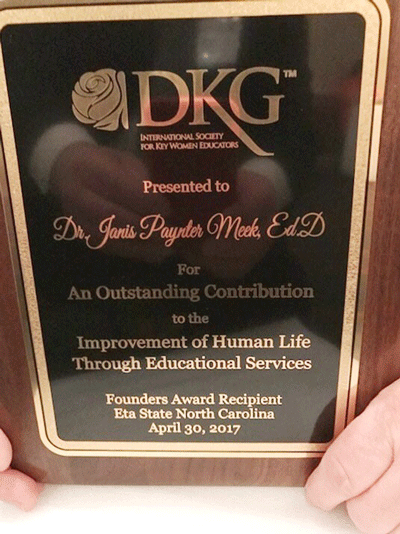April 30, 2017 - Dr. Meek received the above plaque plus a check for $500.00; she graciously gave the check to the Gamma Chi Scholarship/Grant Fund in honor of her former teacher and fellow member Martha Ann Overby |