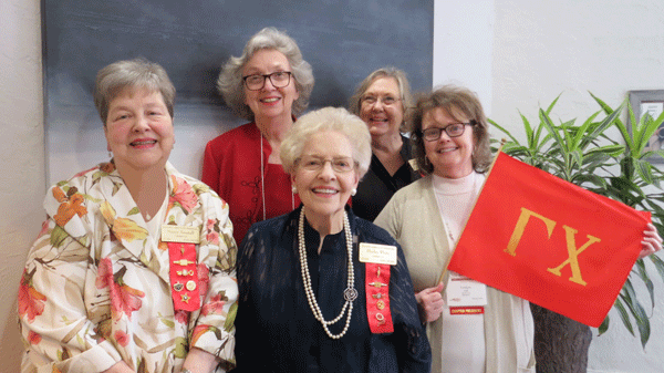 April 30, 2022 - Saturday evening prior to attending the Presidents Banquet, members of Gamma Chi posed for a picture. From left to right: Nancy Tunstall, Betsy Clark, Shirley White, Dr. Sylvia Alston, and President Evelyn Hall holding the Gamma Chi flag. |