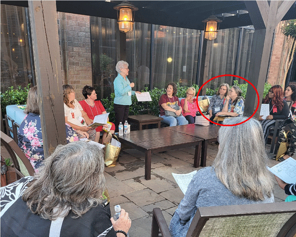 April 28, 2023 - Gail Coleman and Sheila Robertson (circled in red) attended a First Timers Gathering held in the courtyard of the Hilton Greenville. Past President Linda Little conducted the session. There were 79 first-timers registered for the convention. |