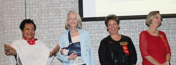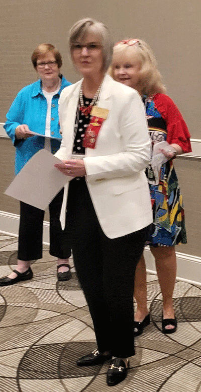 April 30, 2023 - At the podium, Immediate Past President Teresa Cowan applaudes the new 2023-2025 officers as Treasurer Leslie Black and Executive Secretary Elizabeth Miars look on. |