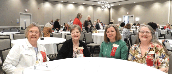 April 29, 2023 - from left, Dr. Sylvia Alston, Nancy Tunstall, Gail Coleman and Sheila Robertson arrive early to get a table close to the front in order to better see Diane Colin and her Littleton Academy Drum Circle perform at the 2nd general meeting on Saturday morning. |