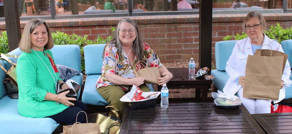 April 29, 2023 - from left, Gail Coleman, Sheila Robetson and Dr. Sylvia Alston are enjoying a bag lunch in the Hilton Greenville courtyard. |