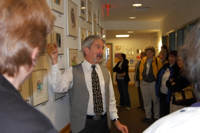 Dr. White explains the Owl Exhibit. There are over 100 original illustrations of owls created by various children's book illustrators created exclusively for this exhibit.